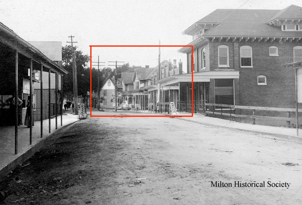 Union Street looking north from the south side of the Broadkill River bridge. The photograph can be reliably dated to post-1912 because of the presence of the commercial building at the right, on the river, which would become part of the Milton Library decades later. The awning on the left is the front of the Fox Theater – today’s Milton Theater – also built around this time. The red rectangle is the area of detail in the photograph below.